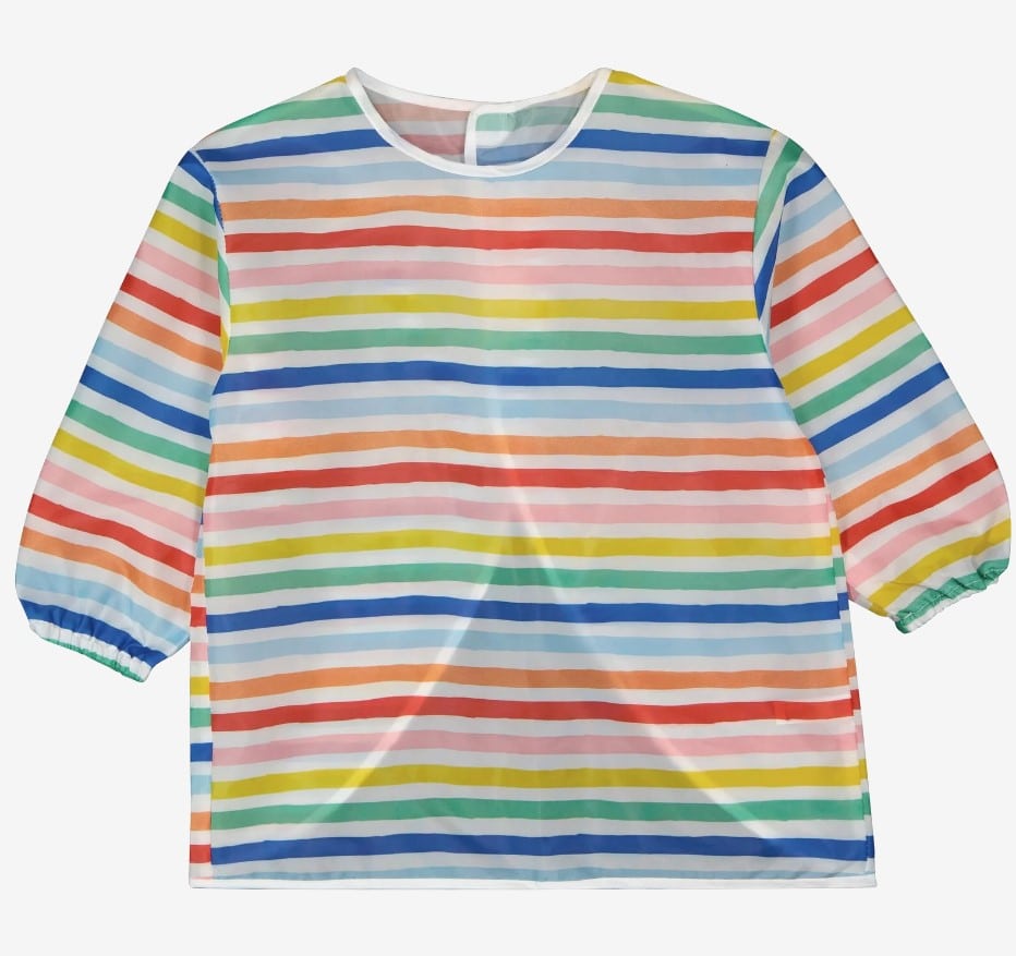 Met dit kliederschort kan je altijd verven en kliederen. Het schort heeft een ronde hals en driekwart mouwen en een vrolijk gestreept dessin. De achterkant is open en heeft een klittenbandsluiting. Zo is het makkelijk aan en uit doen.