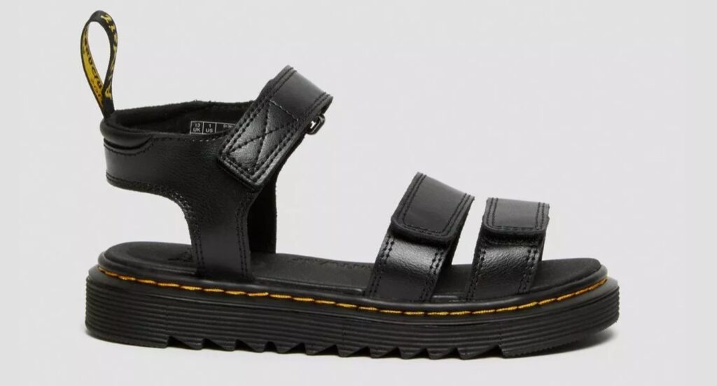 Stoere sandaal van Dr. Martens, gemaakt van gecoat leer. Door verstelbaar klittenband op de voorkant en zijkant van de schoen zijn ze makkelijk aan en uit te trekken. € 70,00 bij Dr. Martens