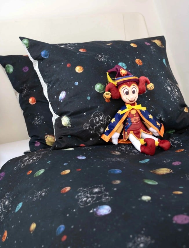 Kruip lekker onder dit dekbedovertrek Symbolica en ontdek de bijzonder mooie sterrenhemel vol kleurrijke planeten en magie. En natuurlijk niet te vergeten Pardoes de Tovernar. Symbolica dekbedovertrek eenpersoons(140 x 200/220 1 sloop) € 79,95 bij SNURK.