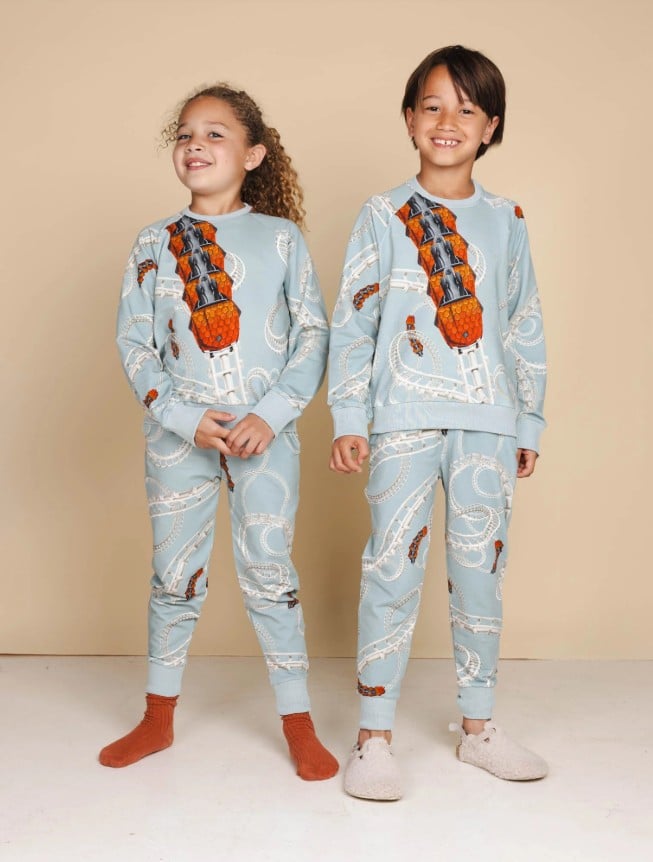 Droom jij er ook nog over, wanneer je een ritje hebt gemaakt in de Python? Denderend over de rails en in sneltreinvaart de loopings en kurkentrekkers tegemoetkomen. In deze Python outfit beleef je vast weer jouw snelle rit in deze spectaculaire achtbaan. Python sweater en broek set € 87,90 bij SNURK.